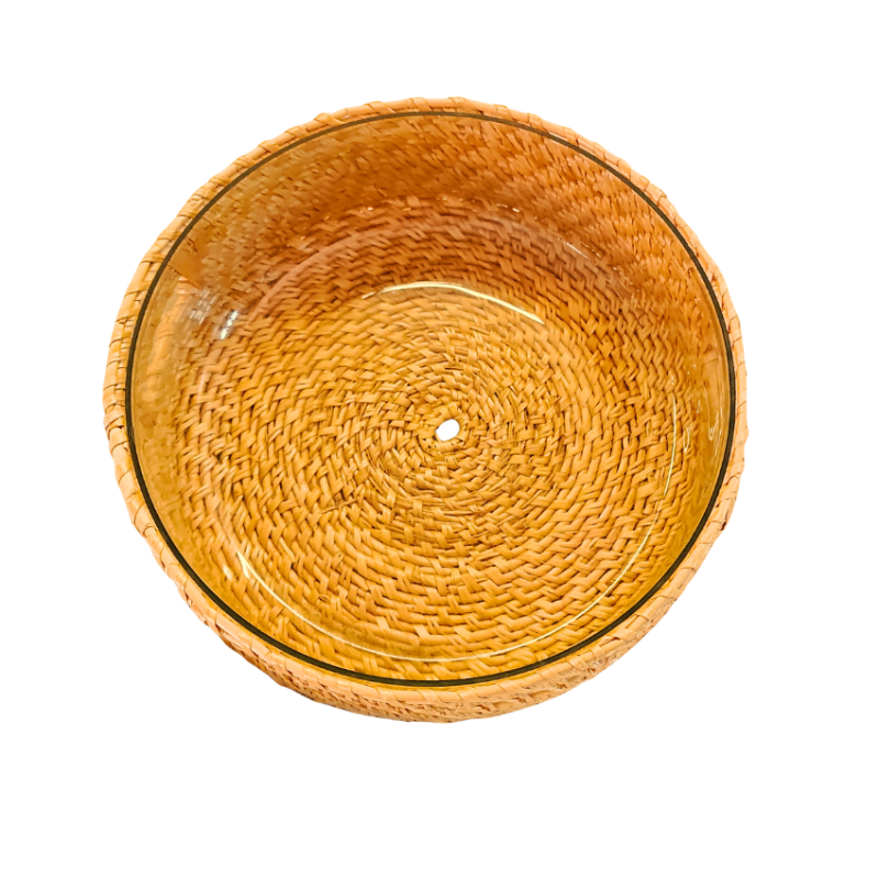 Korocraft Golden Grass Glass Pot Cover (Pedi). Handcrafted by skilled artisans, this unique piece combines natural golden grass weaving with a clear glass base, creating a perfect harmony of tradition and modern design.